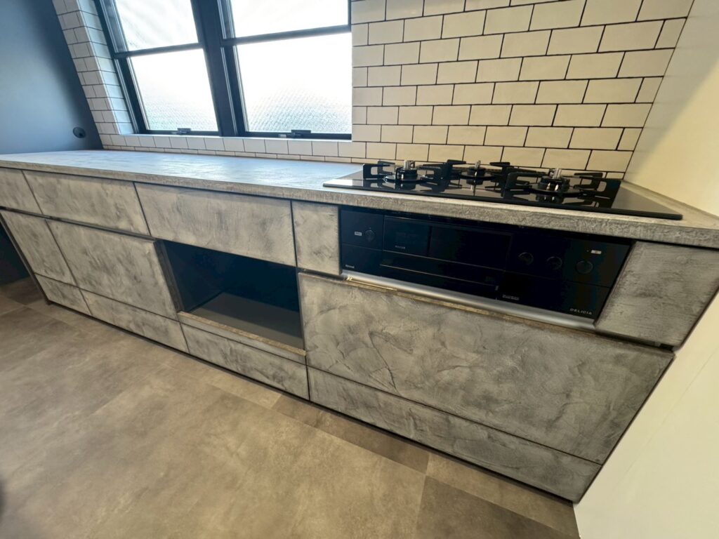 素材の質感にこだわったモルテックス仕上げのオリジナルキッチンを住まいの中心に配置。空間全体と