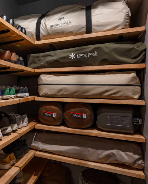 玄関土間に設けた棚にキャンプ道具がぴったり収まり、出し入れもスムーズ。
