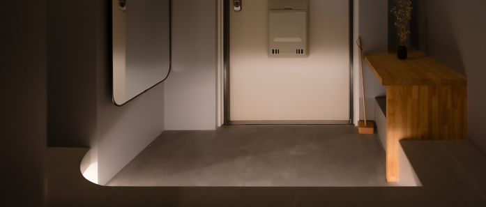 上がり框の下に仕込んだ間接照明が、玄関に奥行きと高級感を演出。夜の帰宅時にほっとする、雰囲気抜群の空間に。