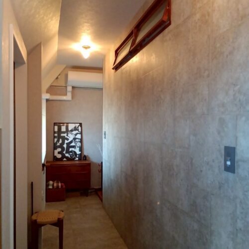 狭くなりがちな廊下を、明るさと奥行きを感じるデザインで広々と演出。壁面をグレーでまとめることで、グレーの壁材と床材で統一し、素材の風合いを活かした落ち着きのある廊下に。柔らかな照明が温かみを添え、通るたびに心が安らぐ空間を演出します。また、空間全体が引き締まり、上品な印象に仕上げました。