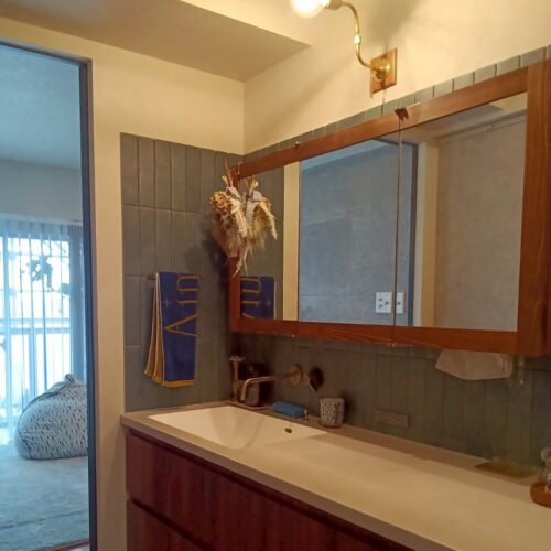 木の温もりとマットなタイルが穏やかに調和する洗面空間。やわらかな照明が手元を優しく照らし、朝も夜もリラックスできるひとときを演出します。
