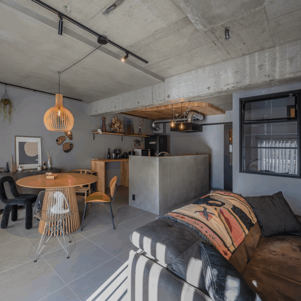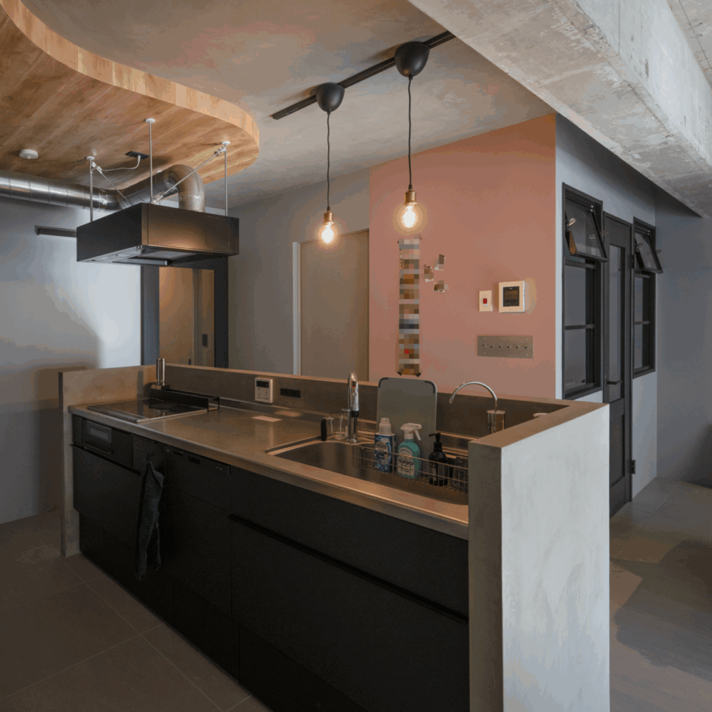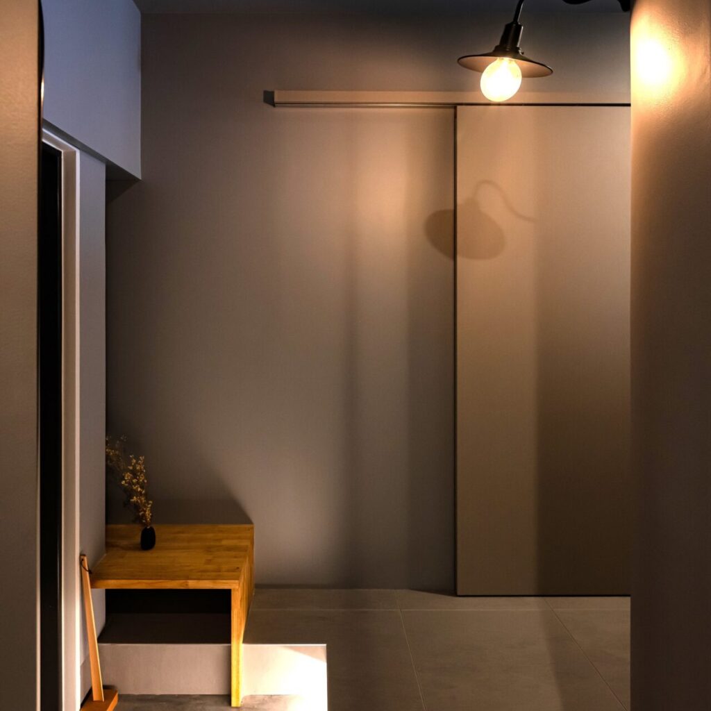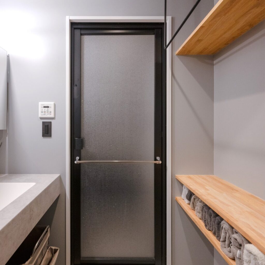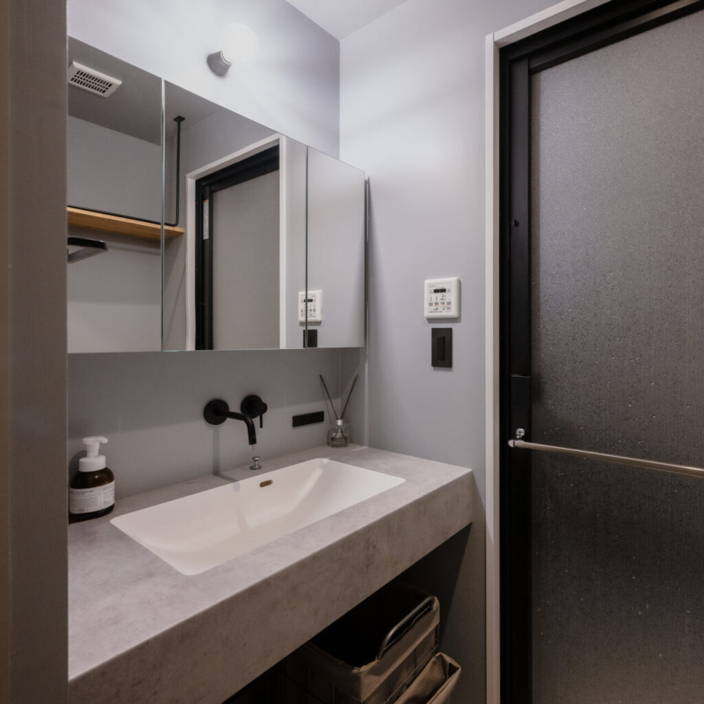 グレーで統一した空間に 黒を少し使うことで全体が引き締まり、メリハリのある印象に。 そこに木の素材を少し加え、無機質になりすぎず、ほどよく柔らかさが加わる。シンプルな構成ながら、色・素材・ラインの使い方にこだわることで、落ち着いた雰囲気と個性を両立した空間に仕上げました。