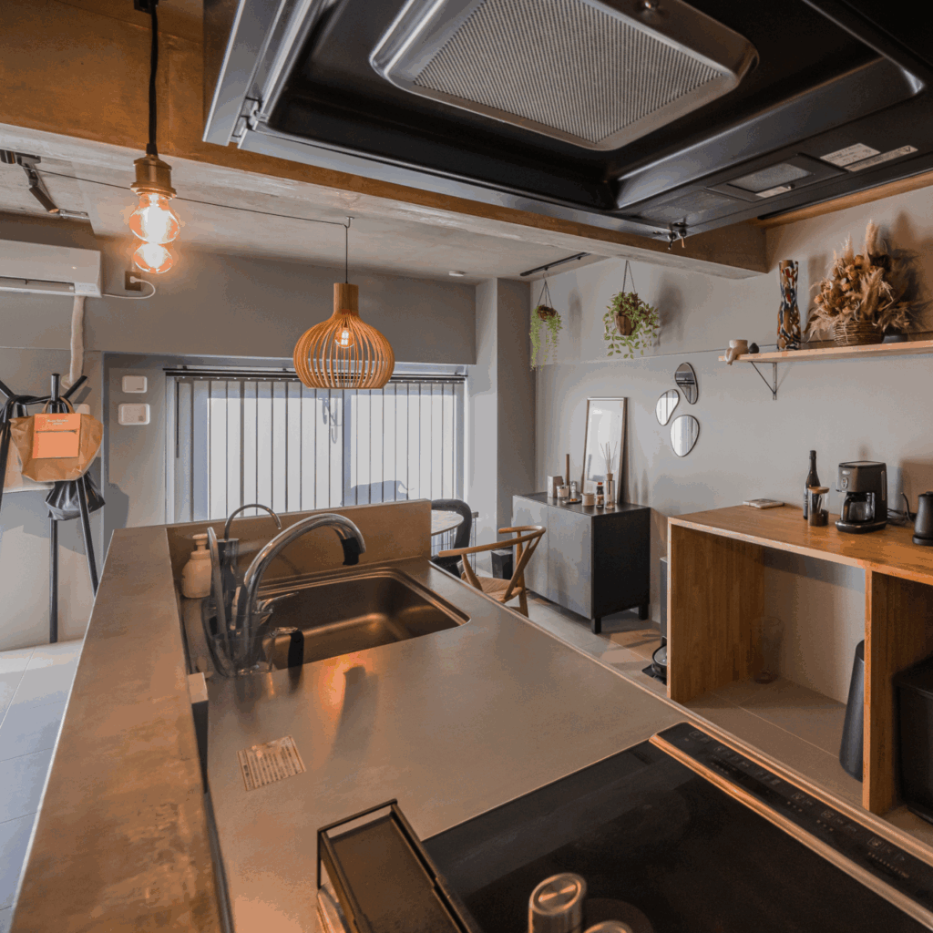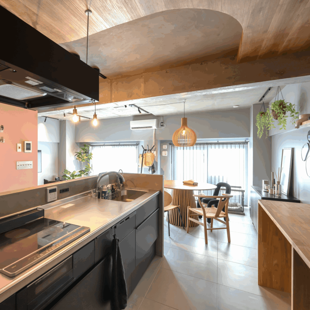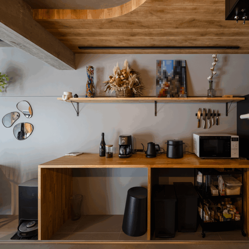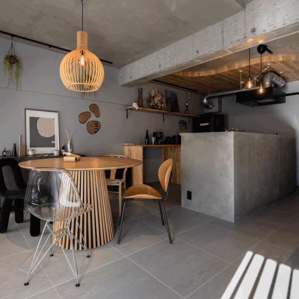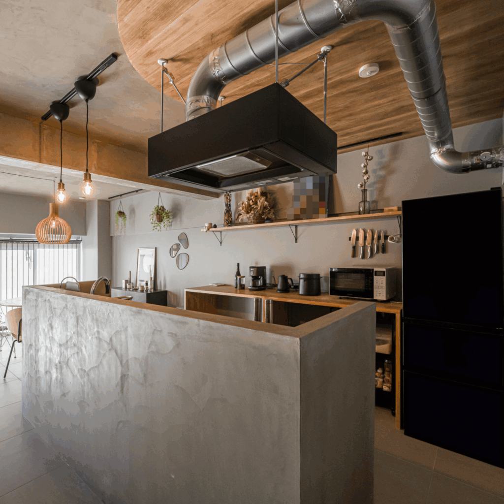 グレーで統一した空間に 黒を少し使うことで全体が引き締まり、メリハリのある印象に。 そこに木の素材を少し加え、無機質になりすぎず、ほどよく柔らかさが加わる。シンプルな構成ながら、色・素材・ラインの使い方にこだわることで、落ち着いた雰囲気と個性を両立した空間に仕上げました。